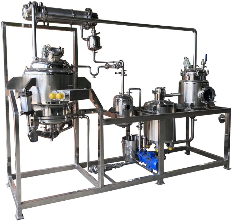 將藥材投入提取罐內(nèi),加藥材的5~10倍的溶媒如水、乙醇、甲醇、丙酮等(據(jù)工藝要求)。開啟提取罐直通和夾套蒸汽閥門,使提取液加熱